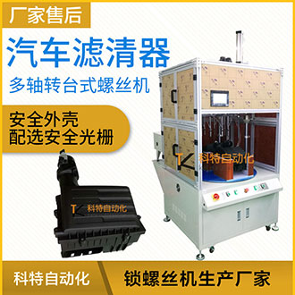 為解決上述汽車濾清器外殼在生產中存在的問題,科特自動化為廠家提供一臺多軸轉臺式自動打擰螺絲機,該設備是根據產品結構以及生產情況設計,以便滿足廠家的生產效率和自動化大規模生產、裝配的需求,設備包括工作臺、機架、工件傳動系統、自動送釘、自動鎖螺絲等,設備配置一個凸輪分割器和圓型工作臺,在轉盤上安放了兩個工位,主要是為了實現擰螺絲和取放產品同步完成,當業作員將產品安放在固定的夾具上設備自動轉動至預設的位置上進行安裝鎖付螺絲,設備還配置了多把電批可同時將產品上的螺絲一次性擰緊,而且還保證每個螺絲在相同扭力下安裝,有效防止滑牙和工件報廢,設備操作簡單,作業員只需不停放置產品,設備不停擰螺絲,增強了人機協作,較大幅度提升效率,減輕人工勞動強度。